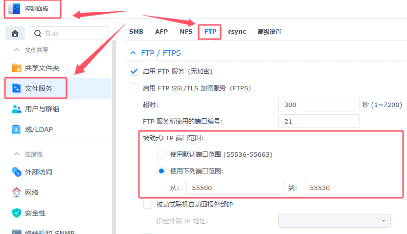 • 此处必须注意“FTP中PASV端口范围”,这个应该是所有FTP服务器软件都支持设置的,必须如实填写,下面是群晖NAS机PASV端口范围设置位置:控制面板-》文件服务-》FTPPASV的中文名就是:被动式FTP端口范围