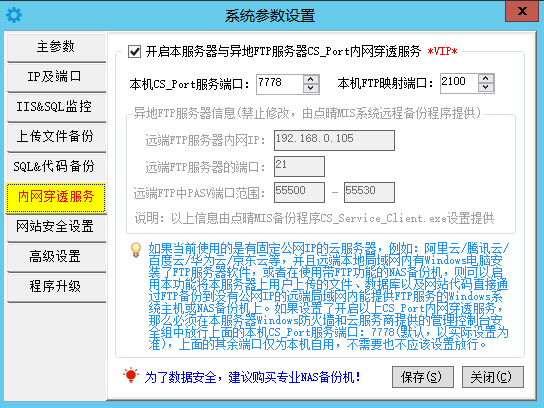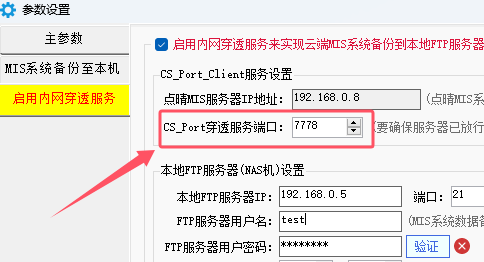 3、然后找到卡片“内网穿透服务”,勾选“开启本服务器与异地FTP服务器CS_Port内网穿透服务”,本机CS_Port服务端口必须与上面点晴MIS系统远程备份程序中的“CS_Port穿透服务端口”一致,“本机映射端口”没有要求,随便一个不冲突的即可,默认是2100: