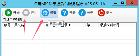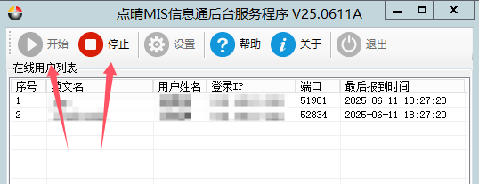 1、点晴MIS服务器上的点晴MIS后台服务程序配置比较简单,远程桌面登录进入点晴MIS服务器,打开点晴MIS后台服务程序,先“停止”当前服务: