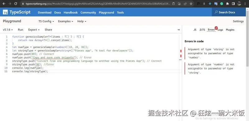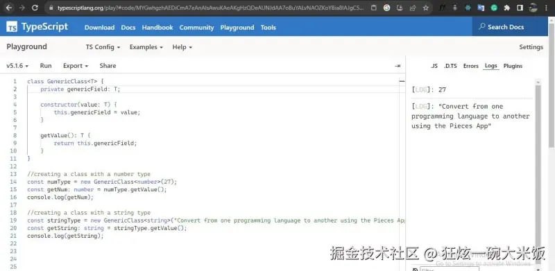 在这里,为了在我们的类中接受多种类型,我们在 TypeScript 中创建了一个泛型类,其类型参数为“T”,这样我们就可以指定要传递给它的任何类型(数字、字符串或任何其他类型)。在这段代码的第一个实例中,我们指定 GenericClass 的值应该是数字类型 27。在第二个实例中,我们指定 GenericClass 的值应该是一个字符串,内容为“使用 Pieces App 从一种编程语言转换为另一种编程语言” 。