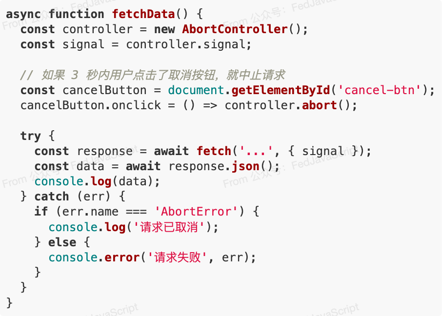 是目前实现 Promise 取消的最佳实践和标准方案。它最初是为取消 fetch