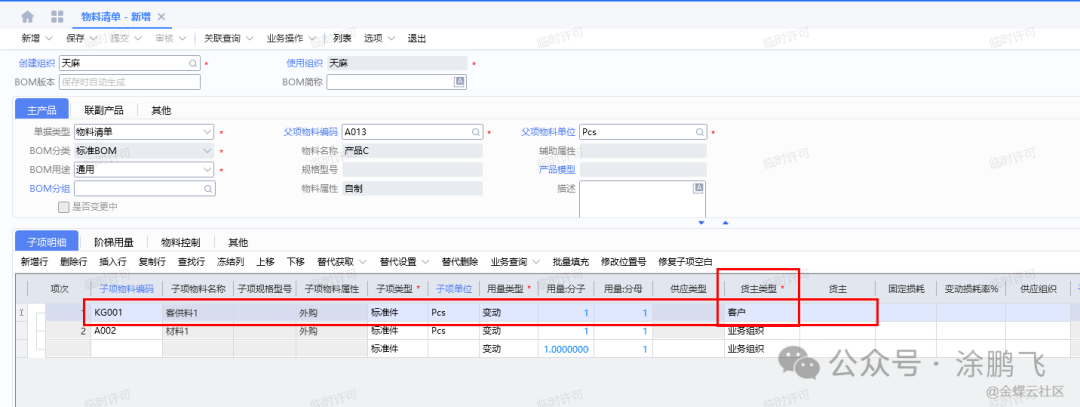 受托加工业务是指企业接受外部客户委托,对客户提供原材料或半成品进行加工处理的一种业务模式。 在系统操作中,受托加工业务涉及多个模块,包括库存管理、生产管理、销售管理及成本核算。客供料需通过受托加工材料入库单进行管理,货主为客户的材料不参与企业自身的成本核算,仅管理库存数量。生产过程中,企业需记录领料、人工费等成本,并最终通过销售出库单和应收单完成与客户的结算。此业务模式的关键在于明确区分客供料与企业自供材料,并确保货主信息准确无误。 1、概述外部公司将原材料或是半成品外发给本公司进行加工,针对本公司来说,这种业务就叫做受托加工业务。 Cloud系统中受托加工整体业务流程涉及六个模块,库存管理、生产管理、销售管理、存货核算及产品成本核算。 受托加工的生产过程可能涉及两种类型的料,一种是受托入库的客供料,一种是加工企业自有材料。本例假设这两种材料都有使用到。 案例:本公司接受客户的委托加工业务,并约定以每件8元的加工费进行结算。仓库接收到客户发给本公司的加工主材料客供料,数量1000pcs。生产车间进行加工材料的生产领料。领料包含客户的客供料,还需领用本公司的库存中的辅料材料。后续完工入库1000pcs产成品C,其中发生人工费若干。加工完成的C产品发出给客户并确认应收款项。 2、基础资料仓库受托加工材料入库的时候可以入库本公司普通仓库,有些企业为了区分不同的客户的材料,也可能设立单独的客户仓库用于存放客供料,可新增客户仓库,如图所示: BOM生产的产品,如明确都是来料加工的情况,一般大部分主要材料是客供料,部分辅料可能是企业提供的,可在BOM中维护设置好对应的货主类型。如果产品既有可能是完全自制,也有可能是来料加工的情况,可分两个不同情况设置对用的BOM版本信息,也可在BOM中不指定货主类型信息,在后续实际生成业务中生产订单生成用料清单之后,在用料清单中修改货主信息及发货仓库信息即可。 本例已知客供料信息,直接在BOM中设置对应的货主类型,BOM设置如图所示: 3、销售订单受托加工业务一般可从销售订单开始,销售订单新增可选择受托加工类型的销售订单,可按需考虑是否勾选【生成受托加工材料清单】,如未勾选,可直接从销售订单下推受托加工材料入库单,系统会按照BOM中货主类型为客户的材料展开入库。如勾选,可通过订单下推受托加工材料收料单,然后根据生成的材料清单下推受托加工材料入库单。