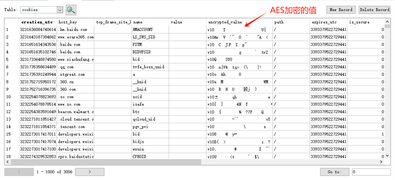 一、基于谷歌内核浏览器的cookie文件保存位置以目前流行的三款基于Chrominum内核的浏览器为例,Cookie文件保存在当前用户的AppData目录下,注意该文件没有扩展名。 1、谷歌的Chrome 2、奇虎的360se 3、微软的Edge 注意360的保存位置略有不同。 二、Cookie文件的格式和加密方式该Cookie文件是sqlite格式的数据库文件,可以用sqlite数据库浏览工具打开查看,如下图: 打开观察发现cookie值是被加密的,采用的加密算法是AES,确切的说是GCM算法。要进行解密则需要知道秘钥key和向量iv。那么key和iv保存在哪? 三、秘钥key在哪秘钥文件在“Local State”文件中,注意这是一个json文件,不是目录,所在位置在Cookies文件的上两层目录中。对应上述三款浏览器分别如下: