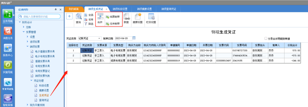在销项生成凭证列表中,支持单张、批量以及合并制单。