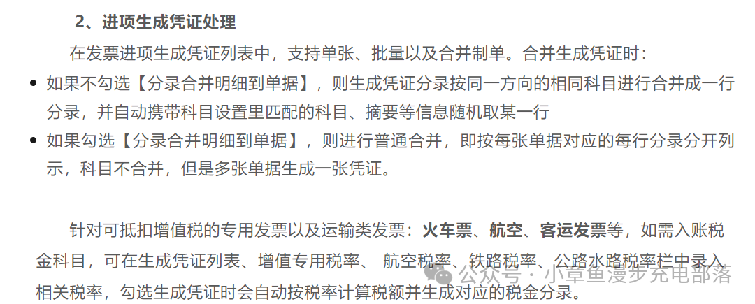 合并制单:规则与销项类似,分录合并或明细分开取决于选项设置。