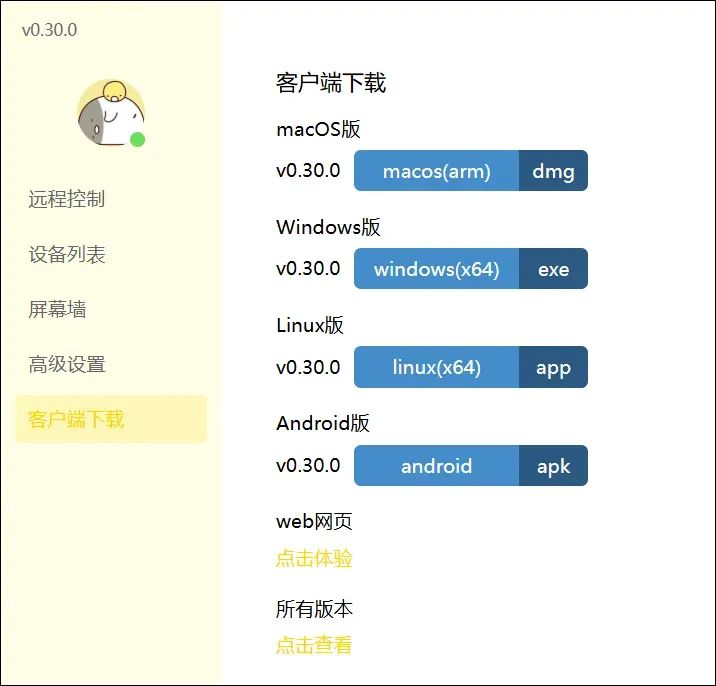 最简单的方式,就是直接打开官方的在线网址:https://desk.hsslive.cn。你可以在这里下载各平台的客户端,或者直接使用 Web 端发起控制,零成本体验项目的核心功能。