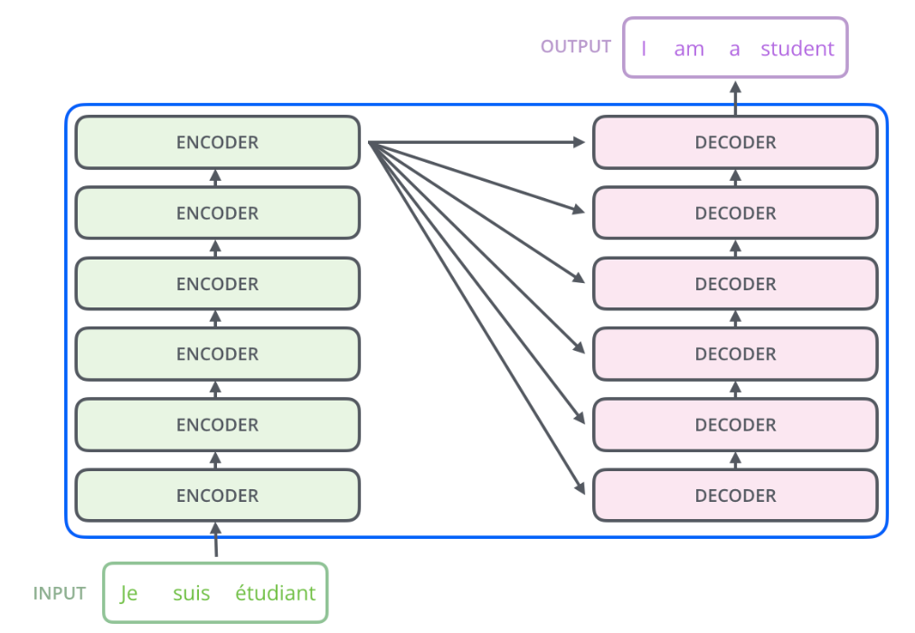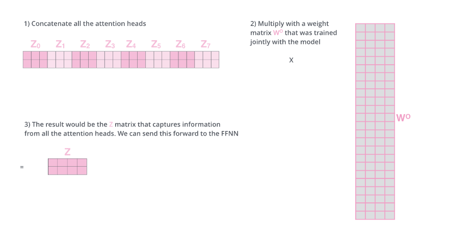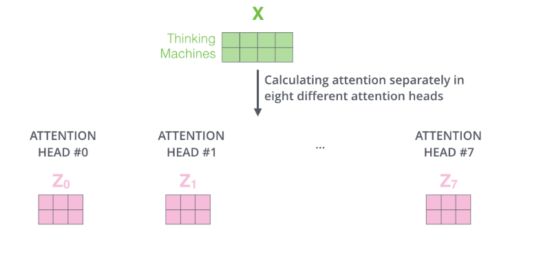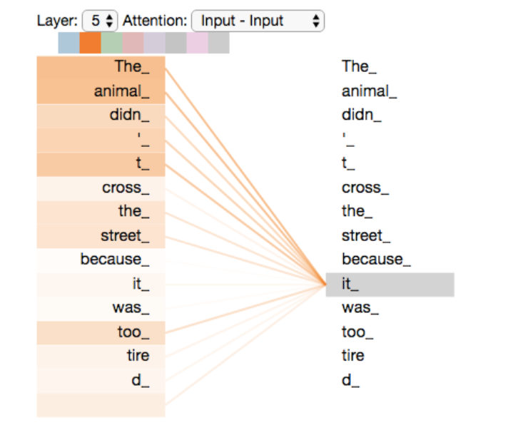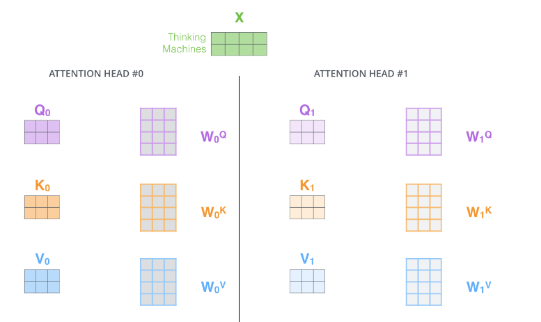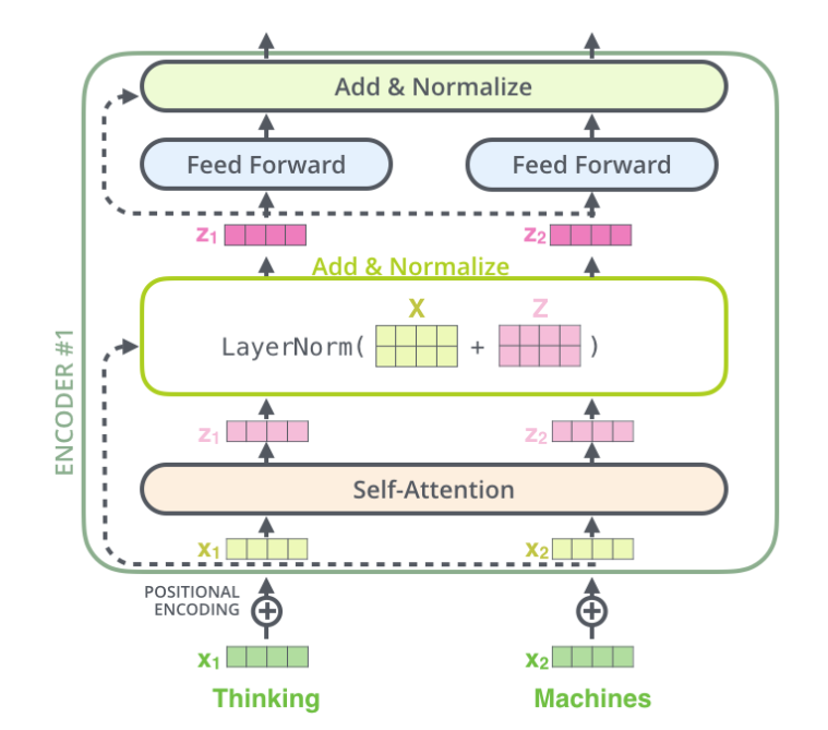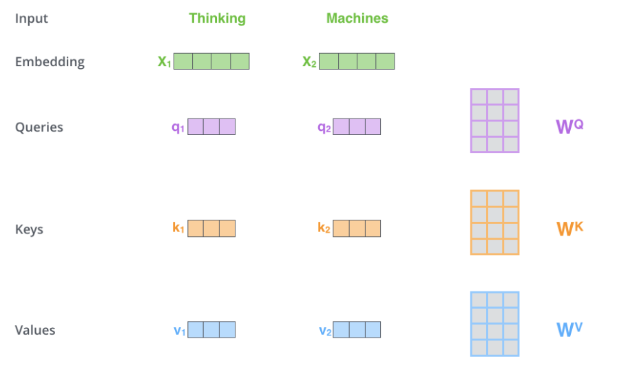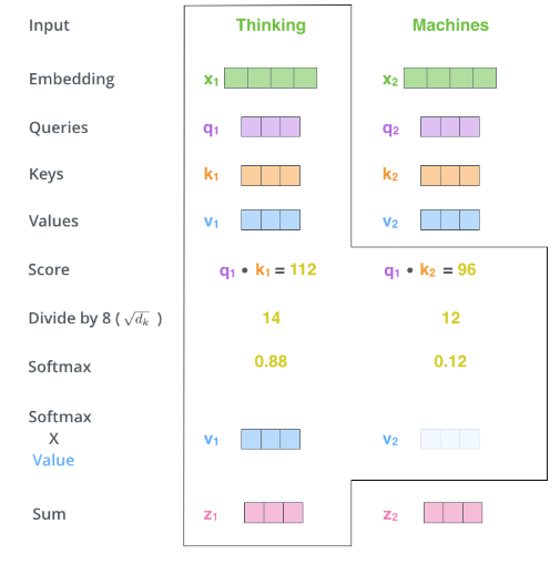 前言 transformer是目前NLP甚至是整个深度学习领域不能不提到的框架,同时大部分LLM也是使用其进行训练生成模型,所以transformer几乎是目前每一个机器人开发者或者人工智能开发者不能越过的一个框架。接下来本文将从顶层往下去一步步掀开transformer的面纱。 transformer概述 Transformer模型来自论文Attention Is All You Need。(https://arxiv.org/abs/1706.03762) 在论文中最初是为了提高机器翻译的效率,它使用了Self-Attention机制和Position Encoding去替代RNN。后来大家发现Self-Attention的效果很好,并且在其它的地方也可以使用Transformer模型。并引出后面的BERT和GPT系列。 大家一般看到的transformer框架如下图所示: transformer模型概览 首先把模型看成一个黑盒,如下图所示,对于机器翻译来说,它的输入是源语言(法语)的句子,输出是目标语言(英语)的句子。 把黑盒子稍微打开一点,Transformer(或者任何的NMT系统)可以分成Encoder和Decoder两个部分,如下图所示。 再展开一点,Encoder由很多结构一样的Encoder堆叠而成,Decoder也是一样。如下图所示。 每一个Encoder的输入是下一层Encoder输出,最底层Encoder的输入是原始的输入(法语句子);Decoder也是类似,但是最后一层Encoder的输出会输入给每一个Decoder层,这是Attention机制的要求。 每一层的Encoder都是相同的结构,它由一个Self-Attention层和一个前馈网络(全连接网络)组成,如下图所示。 每一层的Decoder也是相同的结构,它除了Self-Attention层和全连接层之外还多了一个Attention层,这个Attention层使得Decoder在解码时会考虑最后一层Encoder所有时刻的输出。它的结构如下图所示。 transformer流程串联 transformer的串流需要tensor的加入,输入的句子需要通过Embedding把它变成一个连续稠密的向量,如下图所示。 Embedding之后的序列会输入Encoder,首先经过Self-Attention层然后再经过全连接层。 我们在计算𝑧𝑖时需要依赖所有时刻的输入𝑥1,…,𝑥𝑛,这是可以用矩阵运算一下子把所有的𝑧𝑖计算出来的。而全连接网络的计算则完全是独立的,计算i时刻的输出只需要输入𝑧𝑖就足够了,因此很容易并行计算。下图更加明确地表达了这一点。图中Self-Attention层是一个大的方框,表示它的输入是所有的𝑥1,…,𝑥𝑛,输出是𝑧1,…,𝑧𝑛。而全连接层每个时刻是一个方框(但不同时刻的参数是共享的),表示计算𝑟𝑖只需要𝑧𝑖。此外,前一层的输出𝑟1,…,𝑟𝑛直接输入到下一层。 Self-Attention介绍 比如我们要翻译如下句子”The animal didn’t cross the street because it was too tired”(这个动物无法穿越马路,因为它太累了)。这里的it到底指代什么呢,是animal还是street?要知道具体的指代,我们需要在理解it的时候同时关注所有的单词,重点是animal、street和tired,然后根据知识(常识)我们知道只有animal才能tired,而street是不能tired的。Self-Attention用Encoder在编码一个词的时候会考虑句子中所有其它的词,从而确定怎么编码当前词。如果把tired换成narrow,那么it就指代的是street了。 下图是模型的最上一层Encoder的Attention可视化图。这是tensor2tensor这个工具输出的内容。我们可以看到,在编码it的时候有一个Attention Head(后面会讲到)注意到了Animal,因此编码后的it有Animal的语义。 下面我们详细的介绍Self-Attention是怎么计算的,首先介绍向量的形式逐个时刻计算,这便于理解,接下来我们把它写出矩阵的形式一次计算所有时刻的结果。 对于输入的每一个向量(第一层是词的Embedding,其它层是前一层的输出),我们首先需要生成3个新的向量Q、K和V,分别代表查询(Query)向量、Key向量和Value向量。Q表示为了编码当前词,需要去注意(attend to)其它(其实也包括它自己)的词,我们需要有一个查询向量。而Key向量可以认为是这个词的关键的用于被检索的信息,而Value向量是真正的内容。 具体的计算过程如下图所示。比如图中的输入是两个词”thinking”和”machines”,我们对它们进行Embedding(这是第一层,如果是后面的层,直接输入就是向量了),得到向量𝑥1,𝑥2。接着我们用3个矩阵分别对它们进行变换,得到向量𝑞1,𝑘1,𝑣1和𝑞2,𝑘2,𝑣2。比如𝑞1=𝑥1𝑊𝑄,图中𝑥1的shape是1x4,𝑊𝑄是4x3,得到的𝑞1是1x3。其它的计算也是类似的,为了能够使得Key和Query可以内积,我们要求𝑊𝐾和𝑊𝑄的shape是一样的,但是并不要求𝑊𝑉和它们一定一样(虽然实际论文实现是一样的)。 每个时刻t都计算出𝑄𝑡,𝐾𝑡,𝑉𝑡之后,我们就可以来计算Self-Attention了。以第一个时刻为例,我们首先计算𝑞1和𝑘1,𝑘2的内积,得到score,过程如下图所示。 接下来使用softmax把得分变成概率,注意这里把得分除以8(𝑑𝑘)之后再计算的softmax,根据论文的说法,这样计算梯度时会更加稳定(stable)。计算过程如下图所示。 接下来用softmax得到的概率对所有时刻的V求加权平均,这样就可以认为得到的向量根据Self-Attention的概率综合考虑了所有时刻的输入信息,计算过程如下图所示。 这里只是演示了计算第一个时刻的过程,计算其它时刻的过程是完全一样的。 softmax示例代码: