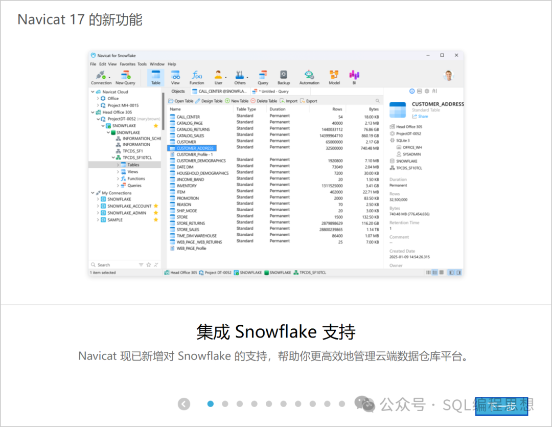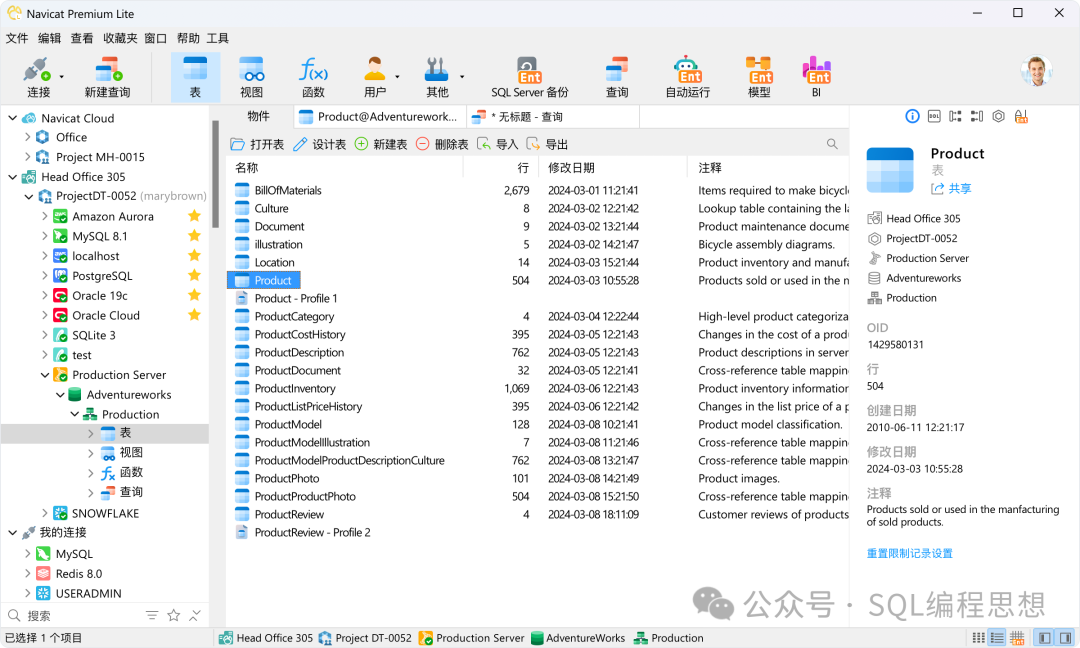 数据源Navicat Premium Lite 允许同时连接到各种数据库平台,包括 MySQL、PostgreSQL、SQL Server、Oracle、MariaDB、Snowflake,以及 Redis 和 MongoDB 等 NoSQL 数据库,所有这些操作都可以通过一个应用程序来完成。此外,Navicat Premium Lite 兼容 GaussDB、OceanBase、TiDB 和 PolarDB 数据库,以及云数据库服务。 Navicat Premium Lite 支持使用 SSH 隧道和 SSL/TLS 进行安全连接,以及 PAM、LDAP、MFA 和 SSO 身份验证方法。 对象设计Navicat Premium Lite 提供了统一的对象设计器,可以管理各种数据库对象和权限,详细设计和查看表、视图、过程等的属性、DDL 语句、依赖关系等。 数据操作Navicat Premium Lite 以类似电子表格的网格视图查看和编辑(插入、编辑、删除、复制或粘贴)表数据,支持排序、筛选、查找/替换等操作。 SQL 开发Navicat Premium Lite 内置了功能强大的 SQL 编辑器,提供语法高亮、代码补全、代码片段、执行计划、格式化等功能,可以方便地编写、编辑、执行 SQL 查询和脚本,并清晰地查看执行结果和消息。 导入导出Navicat Premium Lite 提供向导引导用户完成多种格式(txt、csv、json、xml、sql、html)之间的数据导入和导出,并且允许进行列映射和数据转换。 协同合作Navicat Premium Lite 允许团队实时共享连接设置、查询、模型和虚拟组信息,支持 Navicat Cloud 公有云以及 Navicat On-Prem Server 私有云解决方案。 版本差异相对于 Navicat Premium 企业版而言,精简版限制了不少功能,例如数据生成、数据分析、数据同步、ERD、AI 助手、BI 等,这些功能菜单包含了“Ent”标识。 Navicat Premium Lite 版本和企业版的完整功能差异如下: 下载安装Navicat Premium Lite 支持 Windows、macOS、Linux,官方下载地址如下: https://www.navicat.com.cn/download/navicat-premium-lite 选择对应的平台进行下载并安装。 首次运行需要注册一个免费的 Navicat ID,然后进行登录: 登录之后显示欢迎页面,可以了解一下最新版本功能。 点击”连接“图表或者”文件 | 新建连接“菜单,选择一个数据库类型,例如 MySQL: 输入数据库服务器信息进行连接。 然后就可以开始使用了。 官方网址: https://www.navicat.com.cn/products/navicat-premium-lite 阅读原文:原文链接 该文章在 2025/6/19 18:27:43 编辑过 |