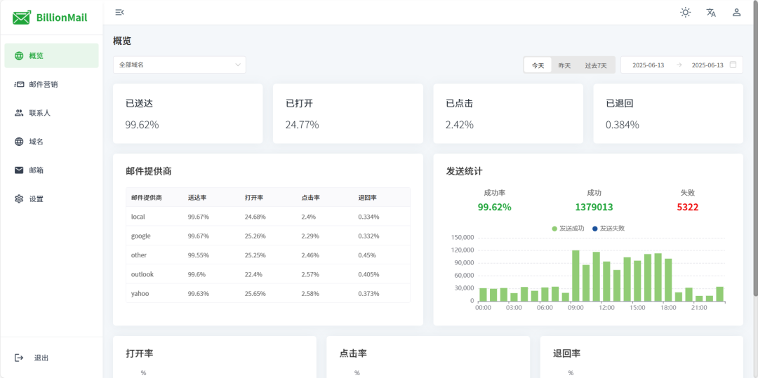 实时展示发送量、送达率、打开率、点击率、退信率等指标,支持按 Google、Outlook、Yahoo 等邮件服务商细分数据,便于评估与优化策略。