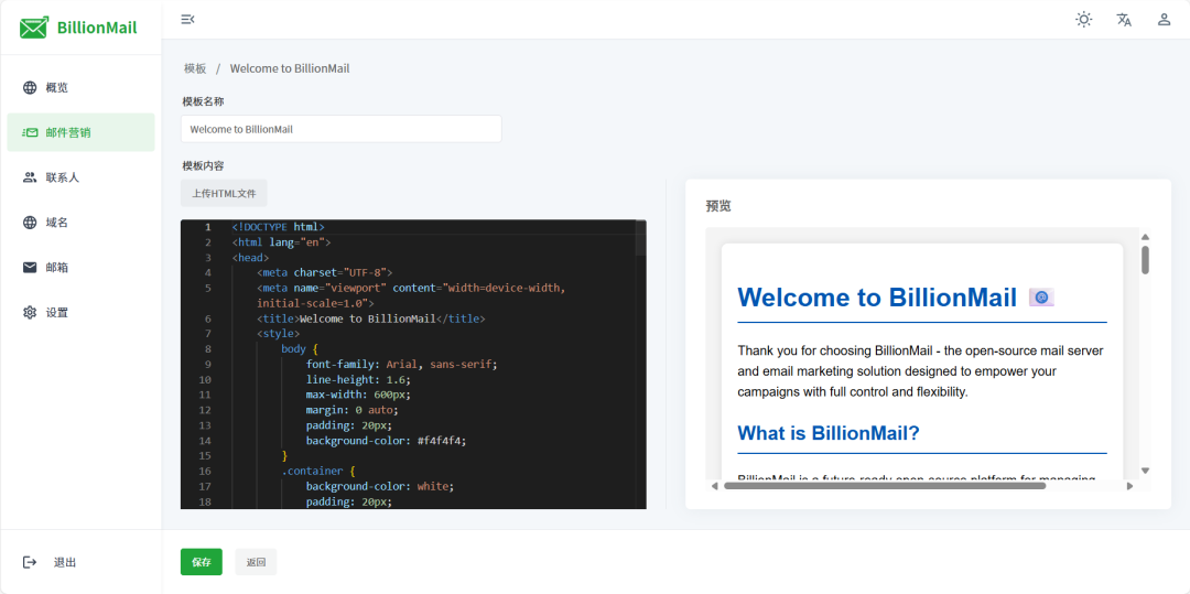 提供可自定义的专业营销模板,支持 WYSIWYG 可视化编辑,具备邮件预览和测试发送功能,确保内容无误。