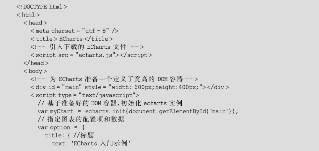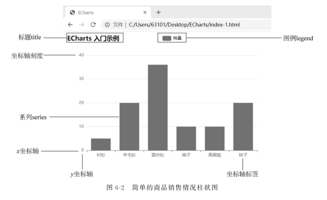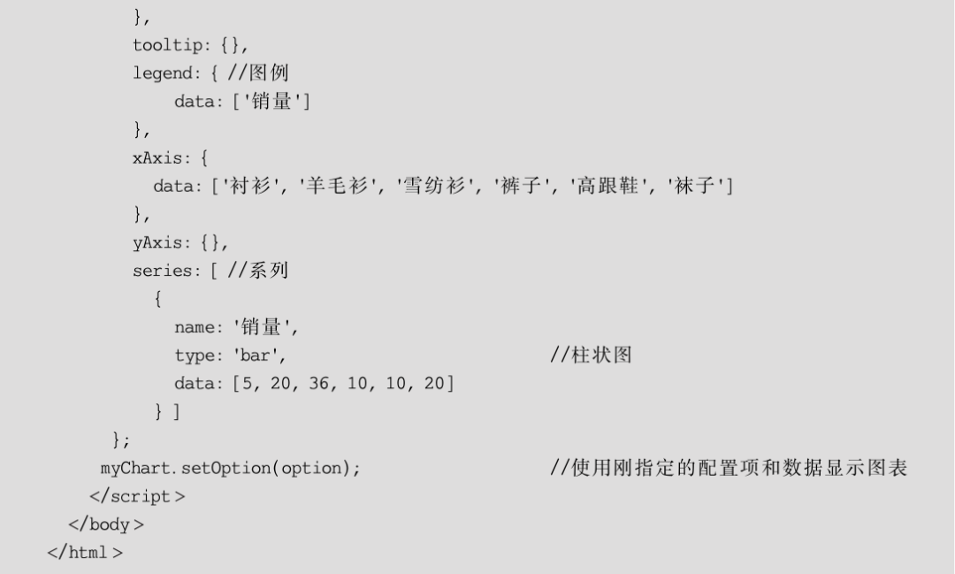 ![]() 近年来,可视化越来越流行,许多门户网站、新闻、媒体都大量使用可视化技术,使得复杂的数据和文字变得十分容易理解。有一句谚语“一张图片价值于一千个字”,的确如此。各种数据可视化工具也如井喷式地发展,ECharts正是其中的佼佼者。 ECharts基础架构 ECharts是基于Canvas技术进行图表绘制的,准确地说,ECharts的底层依赖于轻量级的Canvas类库ZRender。ZRender是百度团队开发的,它通过Canvas绘图时会调用Canvas的一些接口。通常情况下,使用ECharts开发图表时,并不会直接涉及类库ZRender。ECharts基础架构如图6-1所示。 在ECharts基础架构中,基础库的上层有3个模块: 组件、图类和接口。 组件模块包含坐标轴(axis)、网格(grid)、极坐标(polar)、标题(title)、提示(tooltip)、图例(legend)、数据区域缩放(dataZoom)、值域漫游(dataRange)、工具箱(toolbox)、时间轴(timeline)。 ECharts的图类模块近30种,常用的图类有柱状图(bar)、折线图(line)、散点图(scatter)、K线图(k)、饼图(pie)、雷达图(radar)、地图(map)、仪表盘(gauge)、漏斗图(funnel)。图类与组件共同组成了一个图表,如果只是制作图表的话,只需掌握好图类与组件即可完成80%左右的功能。 另外,20%左右的功能涉及更高级的特性。例如,当单击某个图表上的某个区域的时候,能跳转到另外一个图表上; 或当单击图表上的某个区域时,将展示另外一个区域中的数据,即图表组件的联动效果。此时,需要用到ECharts接口和事件编程。 制作第一个ECharts图表 这里使用ECharts绘制一个简单的柱状图图表。 第一步,创建HTML页面。 在保存echarts.js的文件夹新建一个index1.html文件,代码如下: 第二步,为ECharts准备一个具备高宽的DOM容器。 在绘图前需要为ECharts准备一个定义了高宽的DOM容器。在</head>之后添加,代码如下: 实例中,id为main的div,用于包含ECharts绘制的图表。 第三步,初始化echarts实例对象。 通过echarts.init()方法初始化一个echarts实例对象。代码如下: ECharts从初始一直使用 Canvas 绘制图表。而ECharts v4.0以后发布了 SVG 渲染器,从而提供了一种新的选择。只需在初始化一个echarts图表实例对象时,设置renderer 参数为'canvas'或'svg'即可指定渲染器。 至于选择哪种渲染器,一般来说,Canvas 更适合绘制图形元素数量较多(这一般是由数据量大导致)的图表(如热力图、地理坐标系或平行坐标系上的大规模线图或散点图等),也利于实现某些视觉特效。但是,在不少场景中,SVG 具有重要的优势: 它的内存占用更低(这对移动端尤其重要),并且用户使用浏览器内置的缩放功能时不会模糊。 第四步,设置配置信息。 ECharts使用json格式来指定图表的配置项和数据。 第五步,生成显示图表。 通过echarts实例对象调用setOption(option)方法,使用option指定的配置项和数据,显示一个图表,如简单的柱状图。 下面是完整代码。 【例6-1】制作ECharts的商品销售情况柱状图。 代码如下: 运行效果如图6-2所示。 这里对图形中的各种组件进行简单注解,如图6-1所示。一张图表一般包含用于显示数据的网格区域、x坐标轴、y坐标轴(包括坐标轴标签、坐标轴刻度、坐标轴分隔线、坐标轴箭头)、标题、图例、数据系列等组件。 这些组件都在图表中扮演着特定的角色,表达了特定的信息。但这些组件并不都是必备的,当信息足够清晰时,可以精简部分组件,使得图表更加简洁。6.2节将会对各种组件进行详细的介绍。 ECharts基础概念解释 1. echarts实例 一个网页中可以创建多个 echarts 实例。每个echarts实例中可以创建多个图表和坐标系等。DOM节点作为echarts的渲染容器,每个echarts独占一个DOM。 2. 系列(series) 系列是一组数值以及将数值映射成的图表。 一个系列包含的要素: 一组数值、图表类型(series.type)以及其他的关于这些数据如何映射成图表的参数等。 (1) 图表类型(series.type)包括: line(折线图)、bar(柱状图)、pie(饼图)、scatter(散点图)、graph(关系图)、tree(树状图)等。 (2) 数据(series.data): 图表使用的数值。 ECharts 4以前,数据只能声明在各个“系列(series)”中,ECharts 4开始支持dataset组件,用于单独的数据集声明,从而数据可以单独管理,被多个组件复用,并且可以基于数据指定数据到视觉的映射。 关于数据我们会在后面进行学习,这里不展开详细叙述。 (3) 通用的样式(series.itemStyle)。 通用的样式包括阴影、透明度、颜色、边框颜色、边框宽度等。 3. option配置项 option配置项表述了数据、数据如何映射成图形、交互行为。 例如,使用option配置项来描述对图表的各种需求,包括有什么数据、要画什么图表、图表长什么样子、含有什么组件、组件能操作什么事情等。 option是个JavaScript对象,它的内部有大量的属性,每个属性是一类组件; 而多个同类组件可以组成数组。 4. 坐标系 很多系列需要运行在“坐标系”上。例如,line(折线图)、bar(柱状图)等需要在“坐标系”上才能运行。 一个坐标系,可能由多个组件协作而成。我们以最常见的直角坐标系来举例。直角坐标系中包括xAxis(直角坐标系X轴)、yAxis(直角坐标系Y轴)和grid(网格)三种组件。 一个系列往往能运行在不同的坐标系中。例如,一个scatter(散点图)能运行在直角坐标系、极坐标系、地理坐标系(GEO)等各种坐标系中。同样,一个坐标系也能承载不同的系列。 该文章在 2025/6/23 12:32:04 编辑过 |