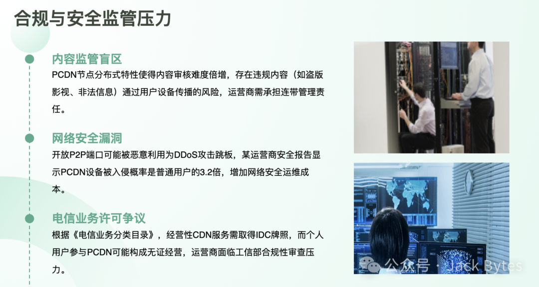 • 电信业务许可争议:根据《电信业务分类目录》,经营性CDN服务需取得IDC牌照,而个人用户参与PCDN可能构成无证经营,运营商面临工信部合规性审查压力。