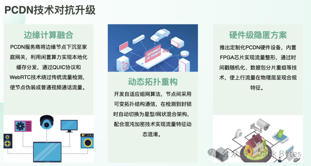 当然,PCDN服务商也可能会进行技术对抗,如通过边缘计算融合、动态拓扑重构、硬件级隐匿方案等技术来隐藏PCDN流量。