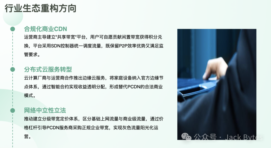 当然,一味的封杀也不是健康的方向,毕竟技术是在持续升级的,可以通过合规化商业CDN、分布式云服务转型、网络中心性立法等方案来引导建立「共享带宽」平台,从而让用户可以自愿贡献闲置资源,并通过运行商的统一调度平台进行流量调度,这样既可以包括P2P效率优势,又能满足监管需求。