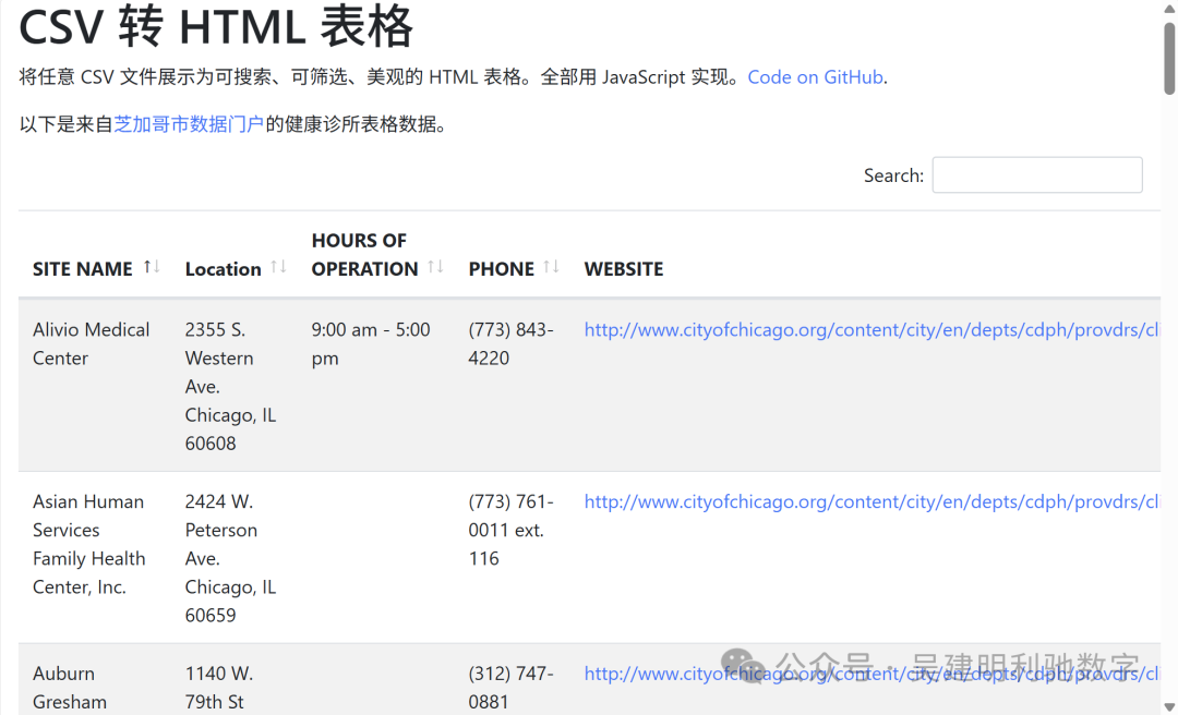 其中核心逻辑在 js/csv-to-html-table.js 文件中,它会把 CSV 文件解析成 JSON,然后动态构建 HTML 表格并注入页面。