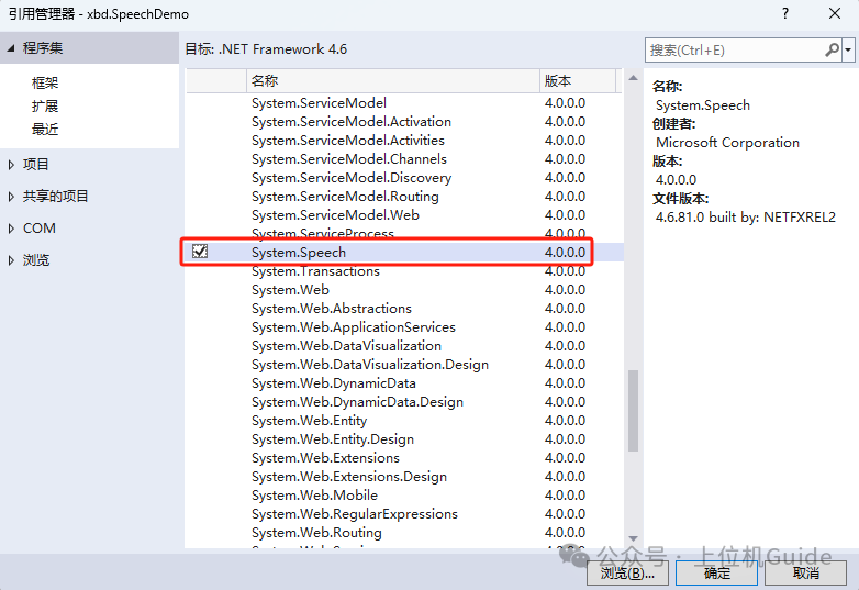 点击引用,右击添加引用,在程序集中,找到System.Speech,这个库是Windows系统自带的,所以直接点击确定即可。