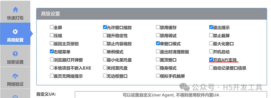HTML转EXE内部支持了串口API, 如果需要使用, 可以在打包时勾选上 启用API: