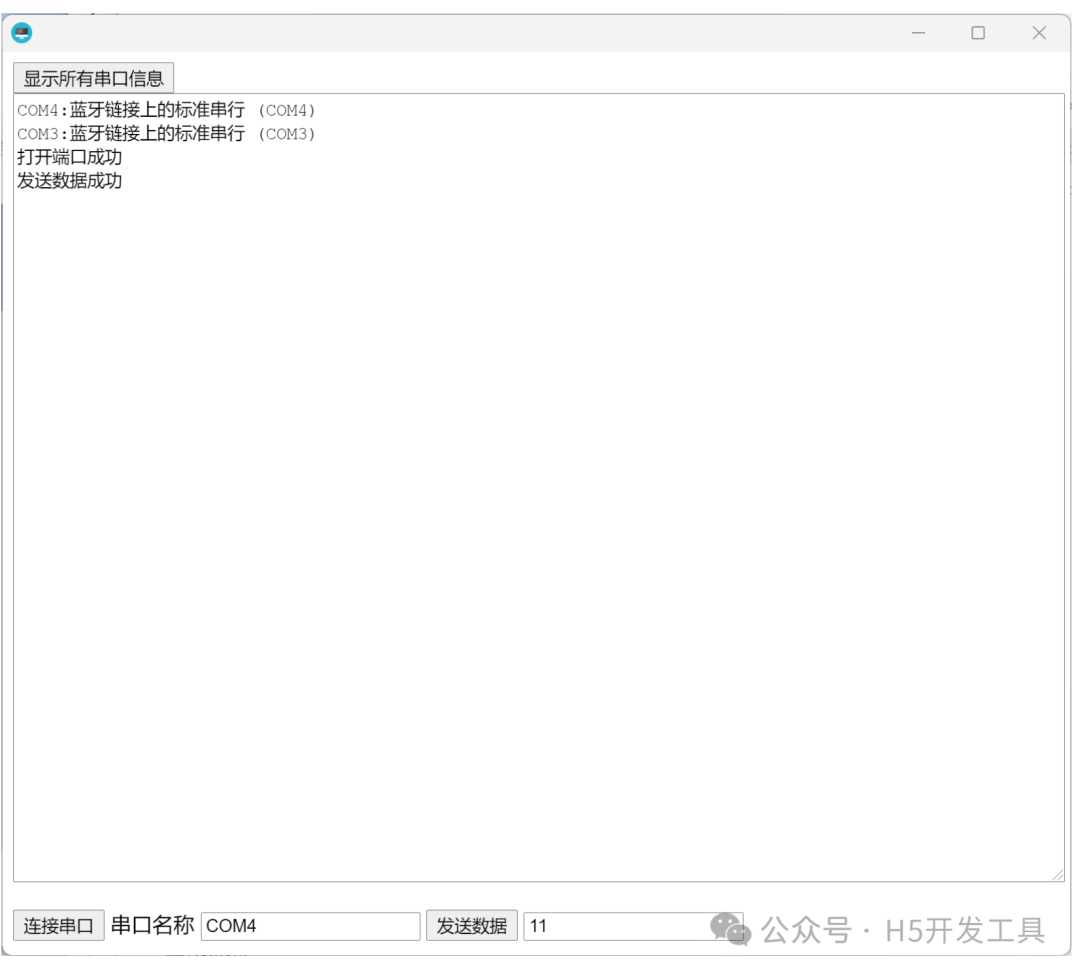 此时, 我们可以在打包生成的EXE中, 先点击显示所有串口信息, 即可列出当前系统中的所有串口名称, 此时我们在打包生成EXE的下方, 输入串口名称(例如COM4), 然后点击连接串口, 即可对窗口进行连接, 此时我们便可以发送数据了.