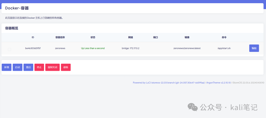 本文以飞牛NAS或istoreos为例。在镜像管理中,直接搜索镜像zeronews/zeronews:latest并拉取。或直接执行下面命令从ZeroNews 公共仓库拉取镜像。