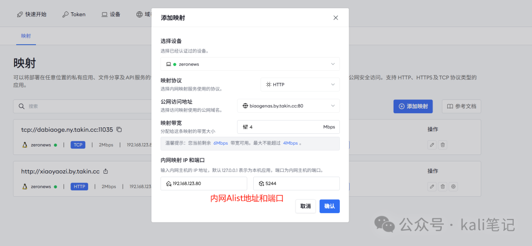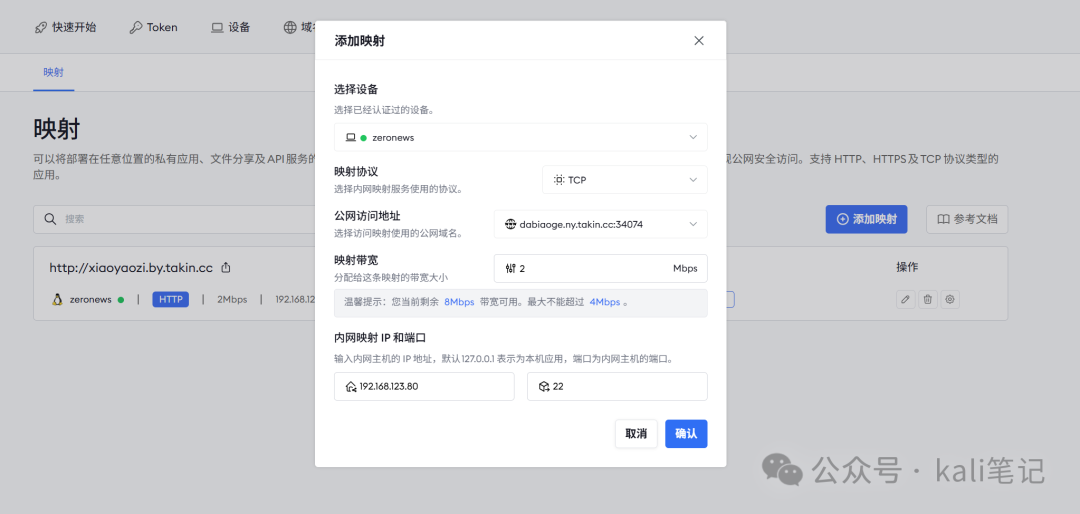 我们可以新建另外一条端口连接,映射到3389端口。方便用户远程登录计算机。注意,因为是远程登录图形化界面。我们带宽要略高点,4M左右差不多。