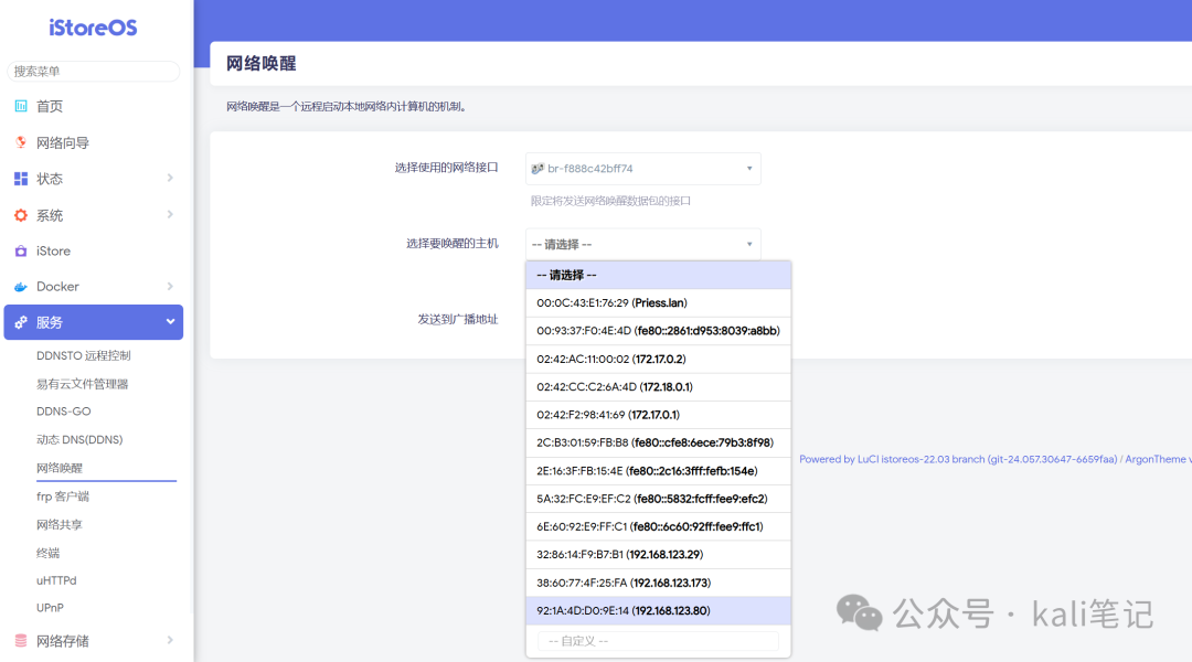 当设备不再使用,关机后。若在想开机使用。我们可以利用前面配置的域名,访问路由器。在路由器中选择唤醒网络设备(目前主流路由器都支持此功能,另外需改开启主板WOL功能)