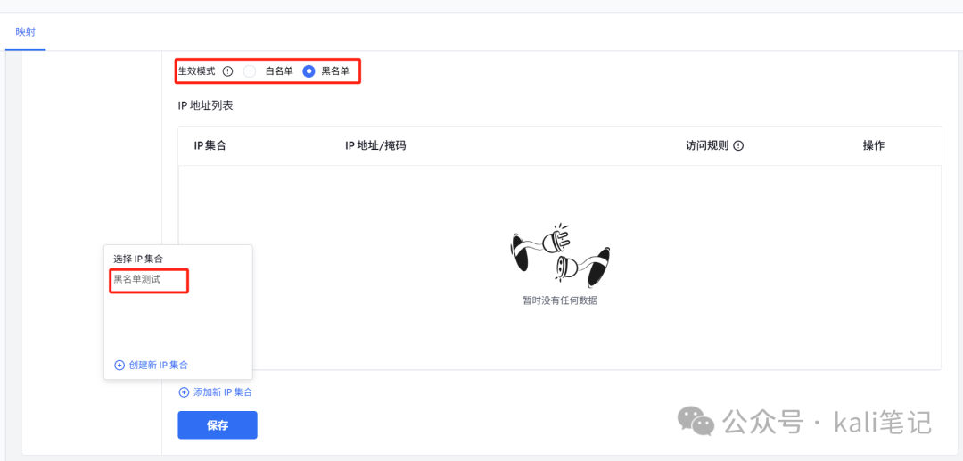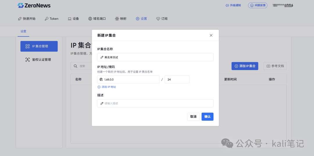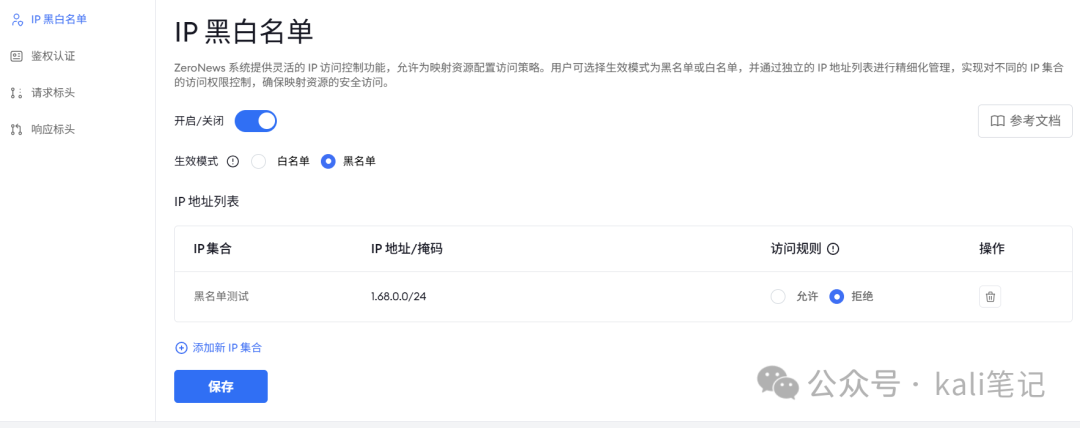 当我们将内网设备暴露在公网环境。设备安全将遭受巨大风险,因此,我们可以设置白名单或黑名单来拒绝/运行来自某些IP 地址或地址段的请求。 点击设置--IP 集合管理 添加对应的IP段