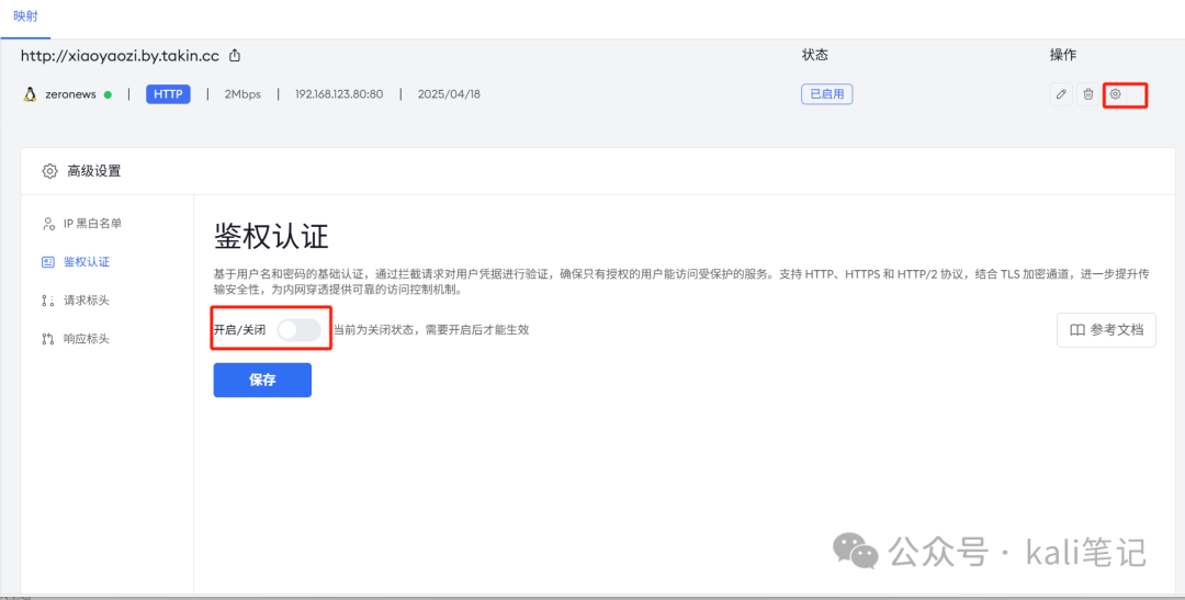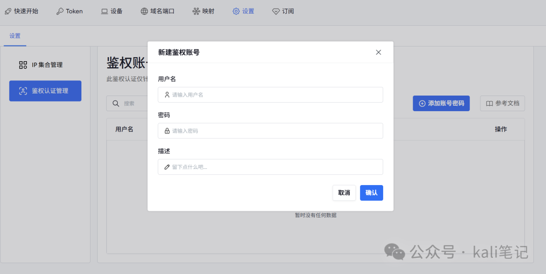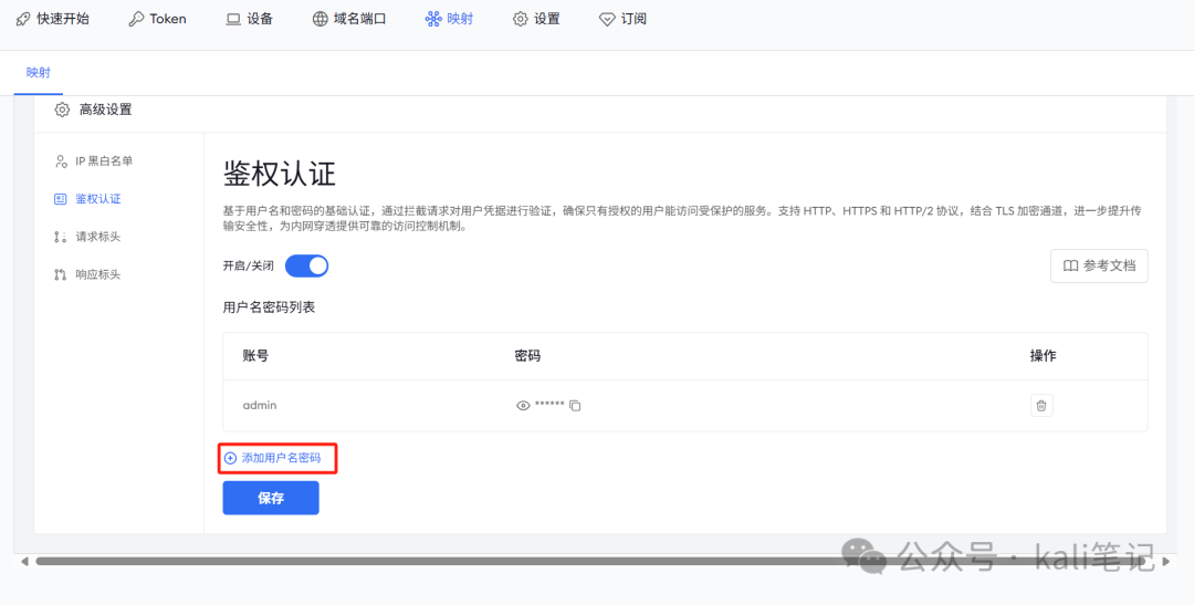 除了IP控制外,我们还可以给访问请求添加鉴权认证。即访问时,添加认证信息。 点击设置--鉴权账号管理--添加账号