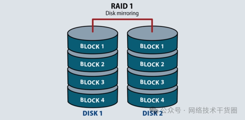 RAID 1通过“镜像”(Mirroring)技术,将数据同时写入两块或多块磁盘,每块磁盘保存完整的数据副本。读取时可以从任意一块磁盘获取数据,写入时则需同步写入所有磁盘。