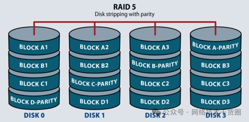 RAID 5通过条带化结合分布式奇偶校验(Parity)实现性能与冗余的平衡。数据和校验信息分布存储在所有磁盘上,任何一块磁盘故障时,可通过其他磁盘上的数据和校验信息重建丢失的数据。
