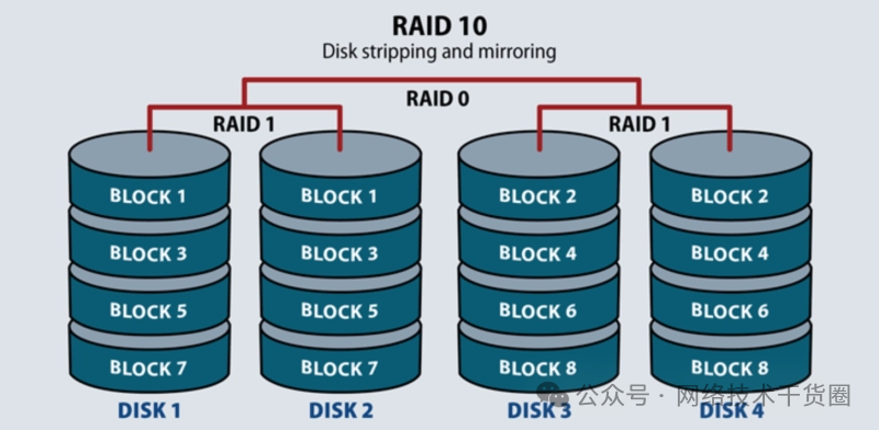RAID 10(或RAID 1+0)是RAID 1和RAID 0的组合。首先将磁盘两两分组进行镜像(RAID 1),然后在镜像组之间进行条带化(RAID 0)。这结合了RAID 0的高性能和RAID 1的高可靠性。