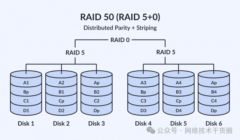 RAID 50(或RAID 5+0)是RAID 5和RAID 0的组合。将磁盘分为多个RAID 5子阵列,然后在这些子阵列之间进行条带化。这种配置在RAID 5的基础上增加了性能和扩展性。