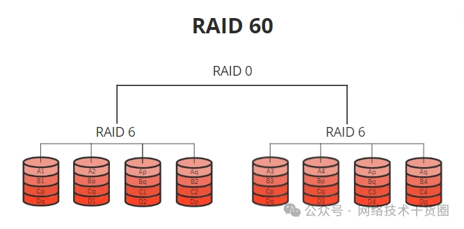 RAID 60(或RAID 6+0)是RAID 6和RAID 0的组合。RAID 6通过双重奇偶校验提供更高的容错能力,RAID 60则将多个RAID 6子阵列进行条带化,进一步提升性能和扩展性。