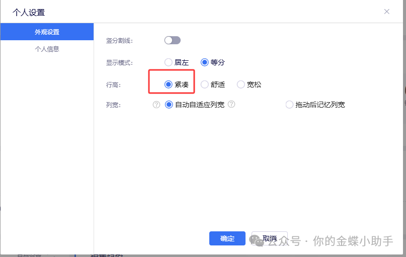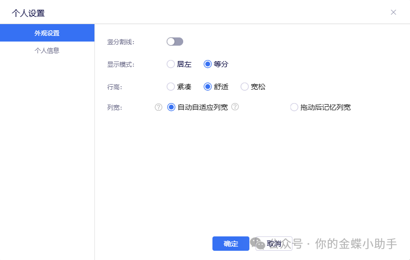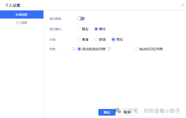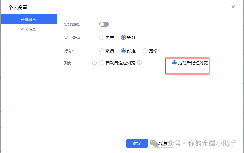 目前系统中的单据,报表的行高、列宽设置可通过账套中的个人设置控制,点击系统主界面右上角头像后,点击【个人设置】