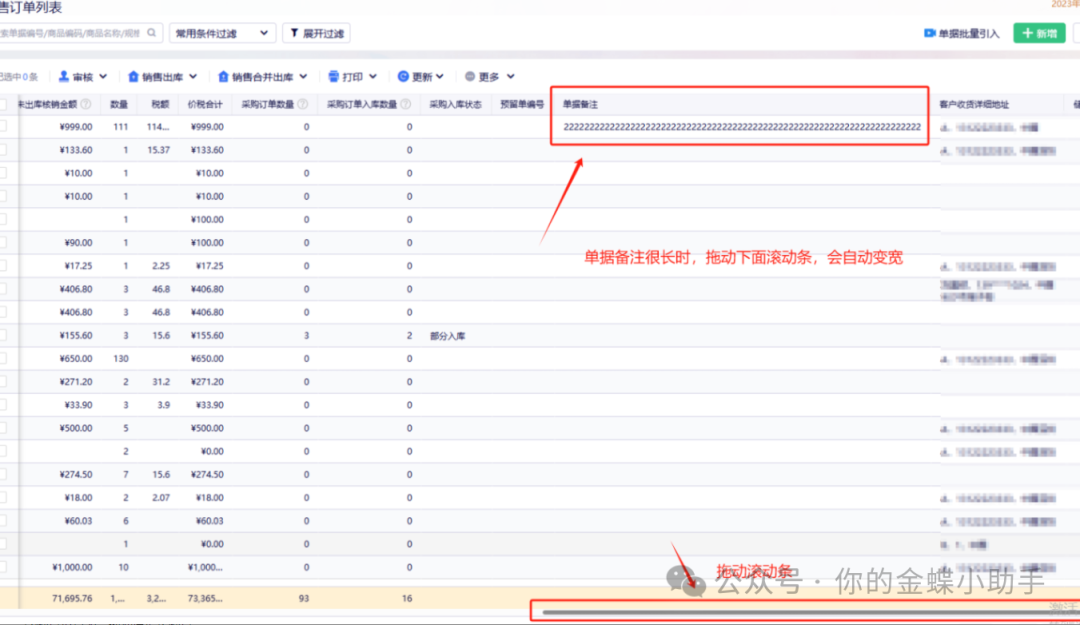 当单据备注很长时,拖动下面滚动条,列宽会自动变宽。