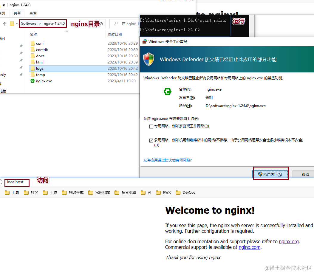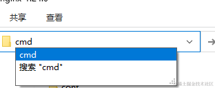 在目录输入框打开 cmd 并运行:start nginx运行 nginx,如果端口没有被占用的话访问 localhost 即可出现 welcome 页面