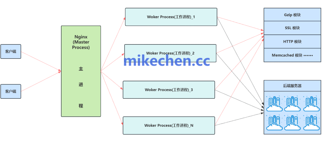 Nginx 的工作进程通过 事件驱动 来管理多个连接,整体架构如下图所示:
