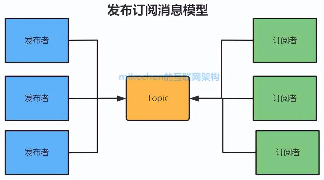 在发布订阅模型中,消息发布者将消息发送到主题(Topic),所有订阅该主题的消费者都可以接收到消息。