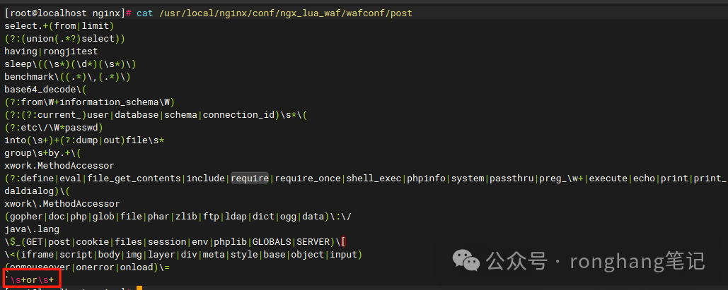 echo "'\s+or\s+" >> /usr/local/nginx/conf/ngx_lua_waf/wafconf/post