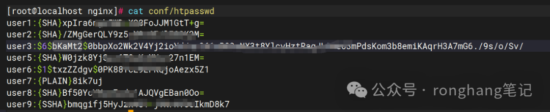 - openssl passwd -6 -salt "bKaMt2" 3edc4rfv # 使用SHA512算法对3edc4rfv加密,生成后的密码手动加入到htpasswd文件中,格式为: