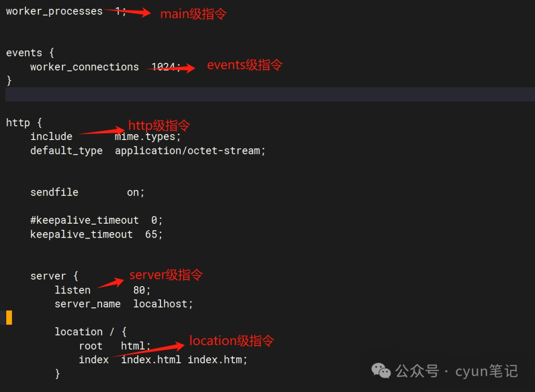 - nginx中有些指令(如root、index)可以出现在不同的层级中,最内层的指令会覆盖上一层的指令,如以下的配置中