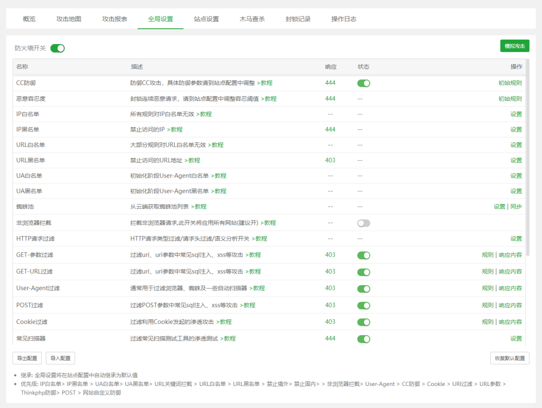 全局设置功能赋予了用户极大的自主权。用户可以设置全局规则,并且支持正则表达式,这意味着规则的设置更加灵活多样。用户还可以自行修改初始化已有的所有规则,同步蜘蛛池等。此外,还能自定义拦截后的影响状态码,让防火墙的拦截行为更加符合我们的预期。
