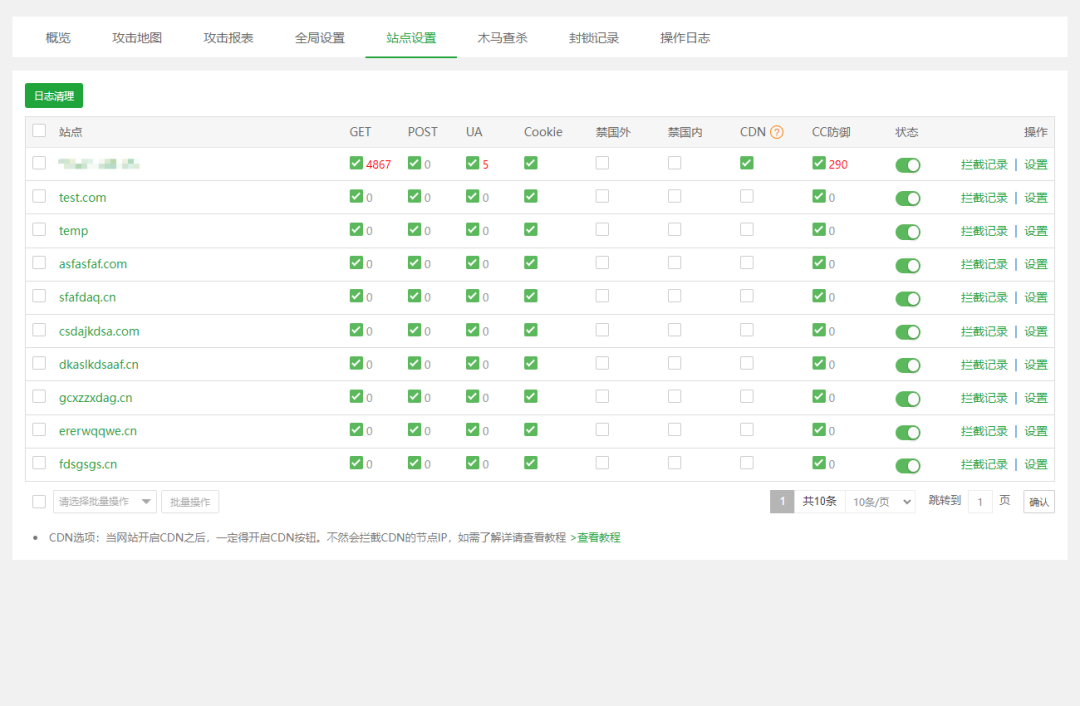 攻击列表功能就像是一个安全监控中心,它会展示保护类型前10万条的数据,包括攻击IP排行榜、攻击IP报表、被攻击的URI报表以及拦截搜索功能。通过这些数据,我们可以清楚地知道哪些IP在频繁攻击我们的服务器,哪些URI是攻击的重点目标,从而有针对性地采取防范措施。