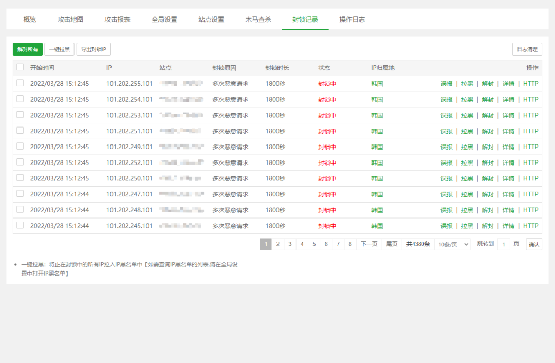 封锁记录功能详细记录了每个站点的封锁情况,包括时间、IP、站点、封锁的原因、封锁时长等信息。通过查看这些记录,我们可以了解服务器的封锁历史,分析攻击者的行为模式,为进一步优化安全防护策略提供依据。