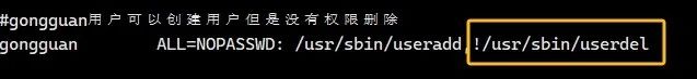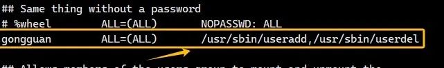 因此,图中第一行表示root用户可以在任何主机以任何人身份来执行所有的命令,第2行表示wheel组中的用户可以在任何主机以任何人身份来执行任何命令,第三行与第二行一样,只是无需输入密码1、下面定义用户gongguan可以执行的命令,如图: