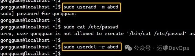 上述命令表示用户gongguan可以在任何主机以任何身份执行useradd和userdel命令,执行未授权的cat /etc/passwd命令就会报错,执行,并提示输入gongguan用户密码,如图: