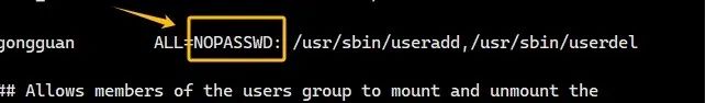 注:配置命令要使用绝对路径,主要是出于安全考虑,如果用户创建了一个相同名字的脚本,那么就很可能导致执行错误,实际执行的是创建的脚本而不是原始的命令如果执行命令的时候不需要输入密码,加上字段NOPASSWD即可,如图: