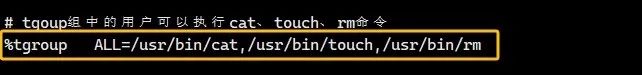 1、定义组可执行的命令,注意,组名前面有个%如图:2、创建tgroup组和三个用户,并将用户userone和usertwo加入到组中,如下:groupadd tgroup