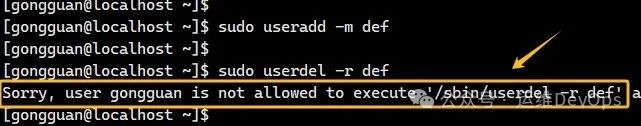 切换到gongguan用户,执行创建和删除命令,可以看到删除失败,如图: