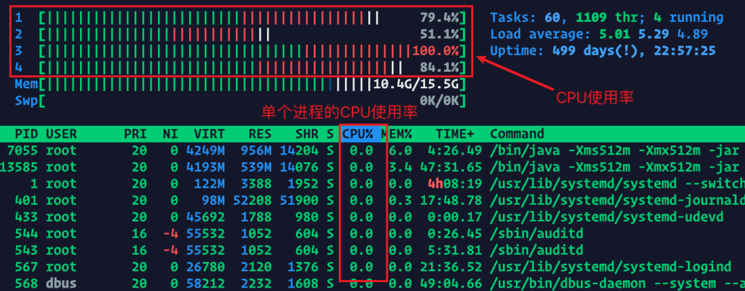 服务器负载分析在性能调优时,需要先对服务器负载进行分析,通常而言,我们主要分析CPU使用率、内存使用率、磁盘I/O,服务器负载和带宽使用情况。 CPU使用率CPU使用率反应的是CPU的忙碌情况。当CPU达到100%时,部分进程会进入等待状态,CPU暂时不会对其进行处理。在实际情况下,为了应对一下突发性的请求压力,服务器CPU使用率一般需要在75%以下。如果一台服务器的CPU使用率多次高于75%,这时候就考虑增加新的服务器。 监控CPU使用率我推荐大家使用htop工具,可以非常直观看到CPU使用率、内存使用率、及负载等信息。 使用htop查看CPU负载首先我们需要安装htop,以centos为例,安装命令如下:
