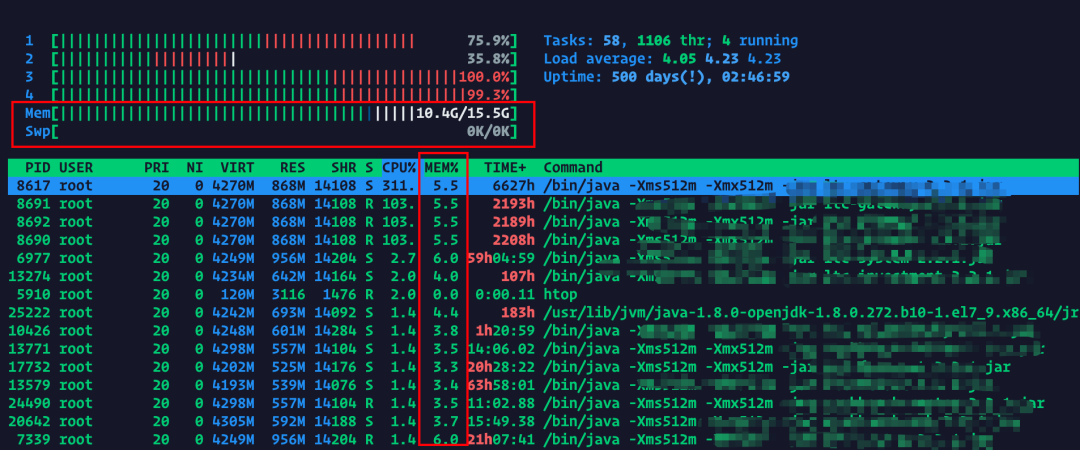 如上图所示,这是一个4核CPU服务器,在截图的时候其中3核CPU使用率都超过了75%,再观察一会发现所有CPU的使用率都在85%左右徘徊,说明CPU负载很高了,需要考虑增加新的服务器。 内存使用率内存使用率反应的是内存的使用情况。内存用于存放程序的代码及数据,一般分为物理内存和虚拟内存,其中物理内存指的是服务器的内存,而虚拟内存指的是硬盘的一块空间。当物理内存使用率达到100%时将会使用虚拟内存。需要注意的是,虚拟内存的读写速度远远低于物理内存,如果程序被放在了虚拟内存执行,那么程序的执行效率会变得很低。 一般而言,服务器的物理内存应该保持在80%以下,虚拟内存使用率保持在0%。 服务器内存使用情况还是可以通过hop工具进行查看